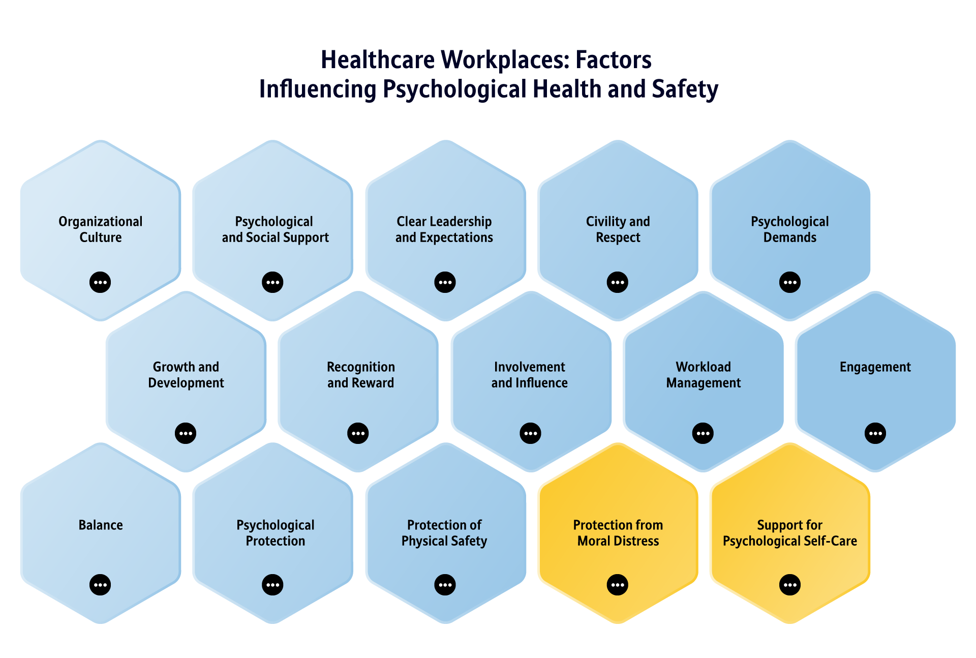 In healthcare, there are 15 factors that can have a positive or negative impact on mental health. These are things like reasonable workload, teamwork, communication, and support. Two of these factors are unique to healthcare: protection from moral distress and support for psychological safe-care.